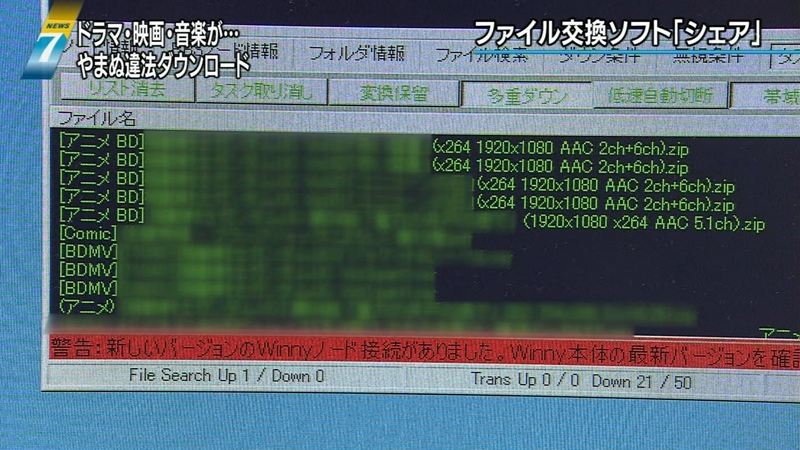 ファイル交換ソフトでは、今も映画や音楽などのファイルが多数、流通していて、WinnyやShareというソフトだけでも、一日の利用者は現在、合わせて15万人程度に上るとみられています。