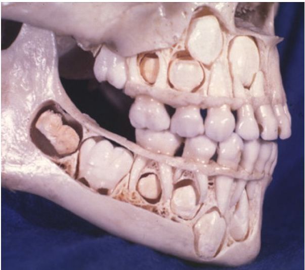という方は、この画像を見れば一目瞭然である。おそらく学術的な分野で使用されているのだろう、この「子供の頭蓋骨」の画像には、本来の歯のほかにも頭蓋骨のなかにポロポロと大きい永久歯が隠れているのが良くわかる。一見ホラー映画にでも出てきそうな怪物のようなその光景に、思わず見入ってしまうだろう。