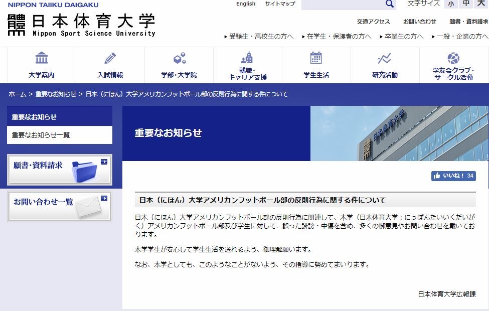 日本(にほん)大学アメリカンフットボール部の反則行為に関連して、本学(日本体育大学:にっぽんたいいくだいがく)アメリカンフットボール部及び学生に対して、 誤った誹謗・中傷を含め、多くの御意見やお問い合わせを戴いております。