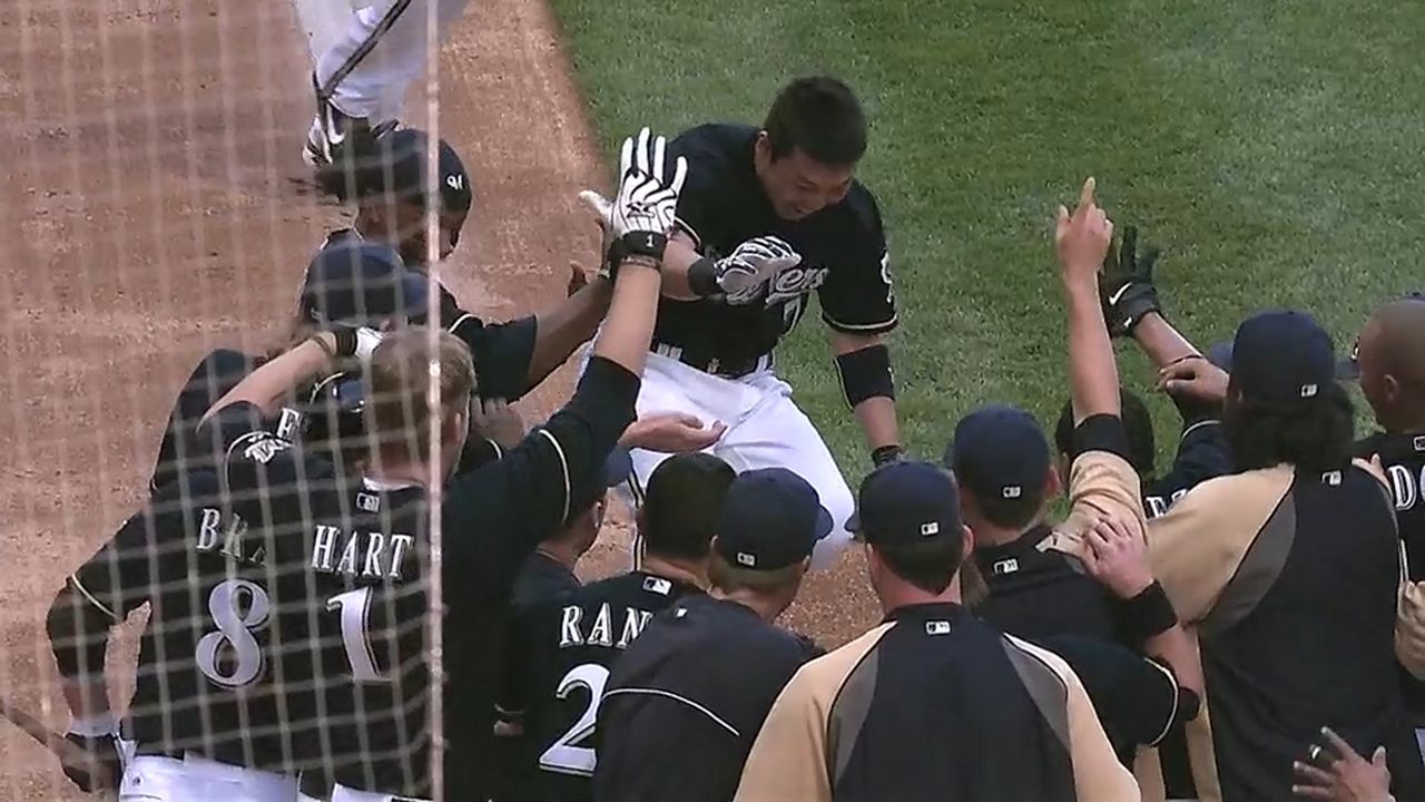 青木は本塁前でヘルメットを投げ、ナインの待つ本塁にジャンプイン。インタビュー中にナインにシェービングクリームのパイを顔面につけられた青木は「まさか2本打てるとは思わなかった。今までランニング本塁打しか打ってなかったわけだから。日本の反応はどうなんですかね? なかなかサヨナラ本塁打はないんで、大きく扱ってくれたらと思います」と白い顔で喜びを爆発させた。