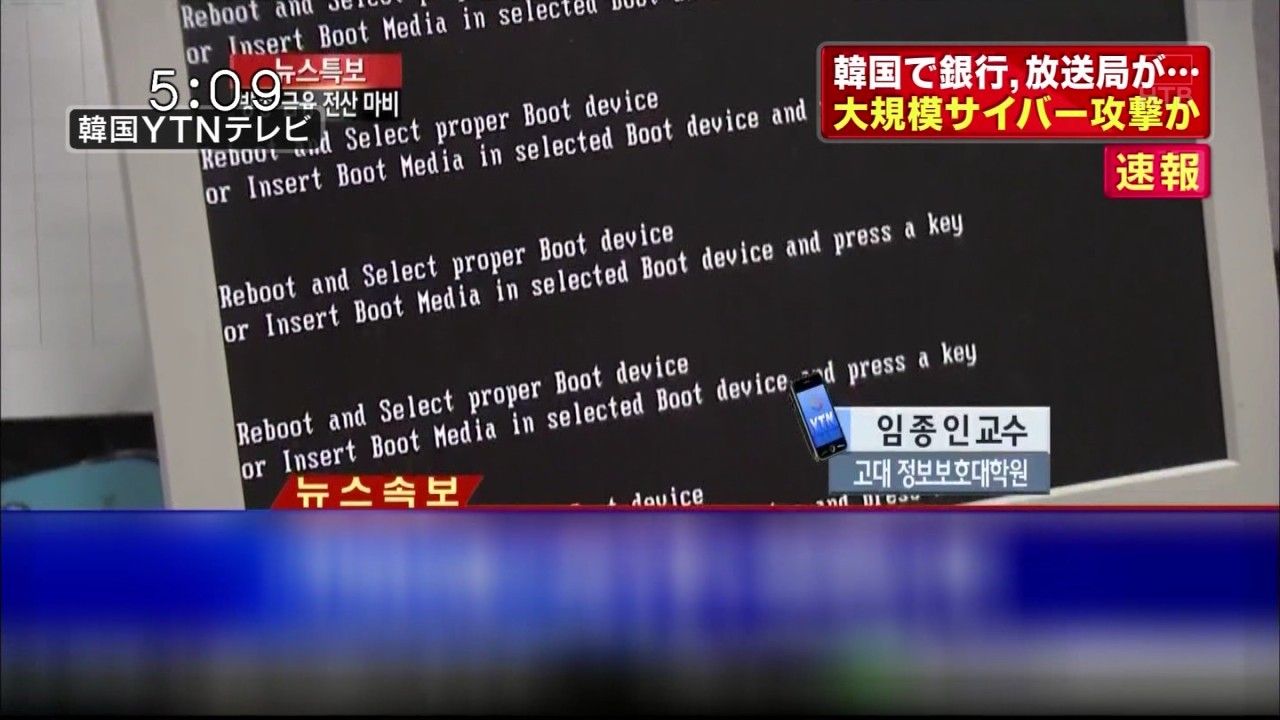 327: イリオモテヤマネコ(チベット自治区):2013/03/20(水) 19:34:13.65ID:B+j5W9Tk020日午後、KBS、MBC、YTN [040300]、新韓銀行、農協など放送・金融機関の電算網を麻痺させた、
