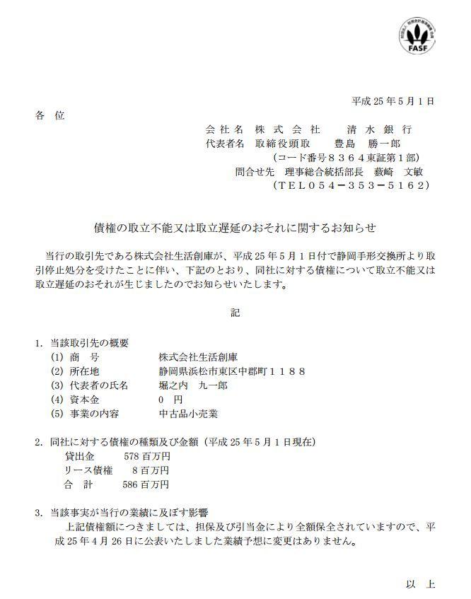 清水銀行、生活創庫の手形取引停止処分で約6億円の債権が取り立て不能の恐れ