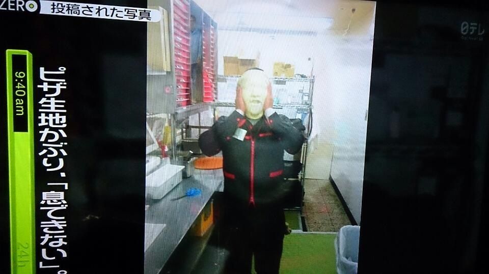 性店員が、ピザの生地をマスクのように顔にかぶり、その写真を簡易投稿サイト「ツ