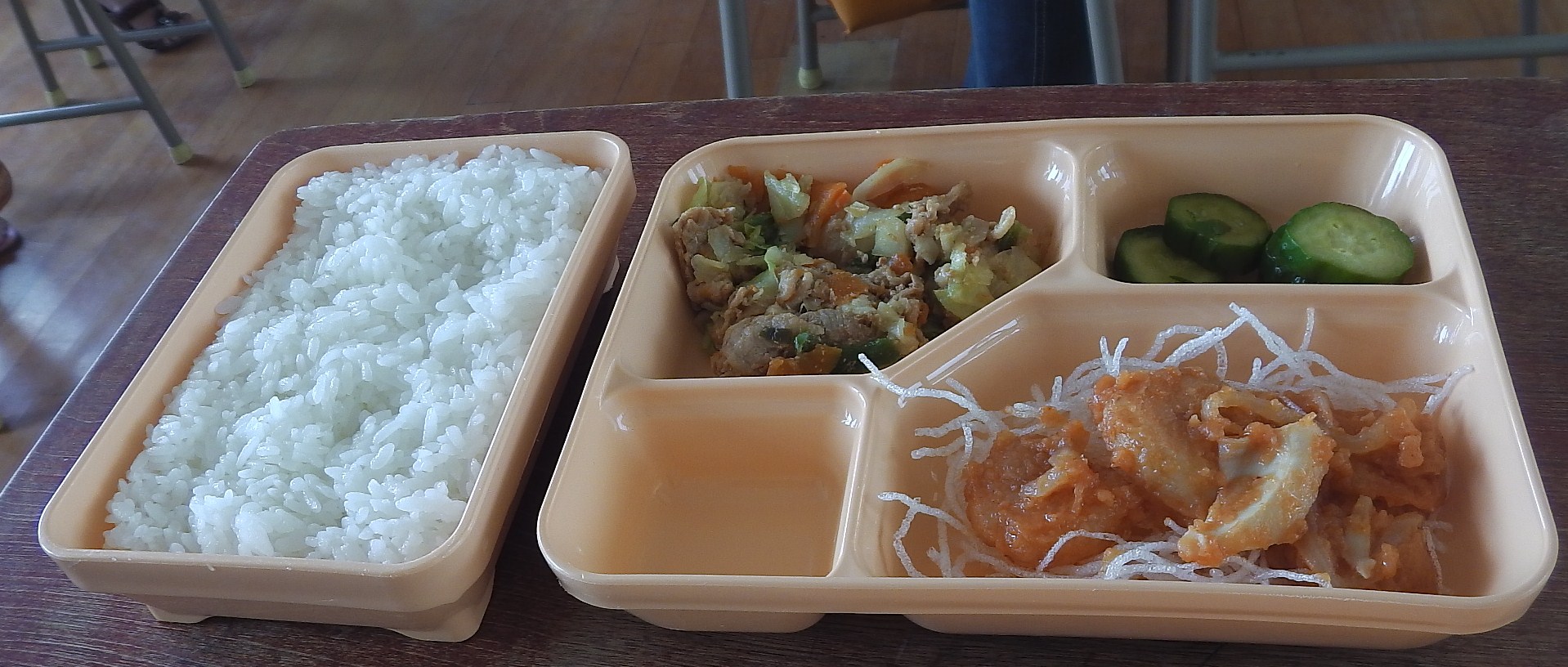 アルミの容器に、主食(+パン)+サラダor果物+牛乳だった。