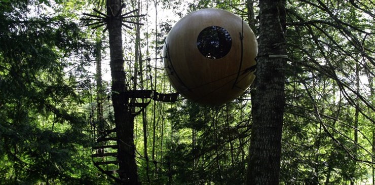 うっそうと緑生い茂る森に浮かぶ3つの怪しげな球体。ホテル「Free Spirit Spheres」である。