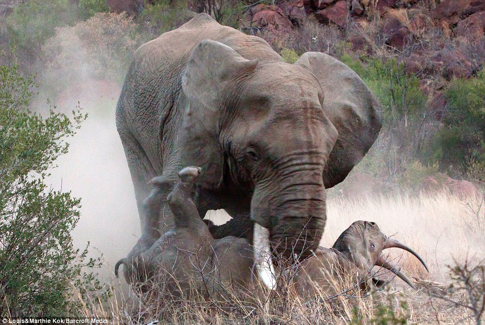 ¥¹¥Ý¥ó¥µ¡¼¥É¡¡¥ê¥ó¥¯Battle of the giants: Testosterone-fuelled elephant fights black rhino as she protects her calf