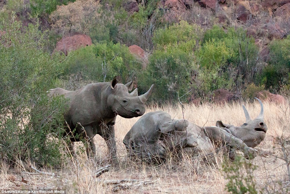 http://www.dailymail.co.uk/news/article-2765034/Battle-giants-Testosterone-fuelled-elephant-fights-black-rhino-protects-calf.html