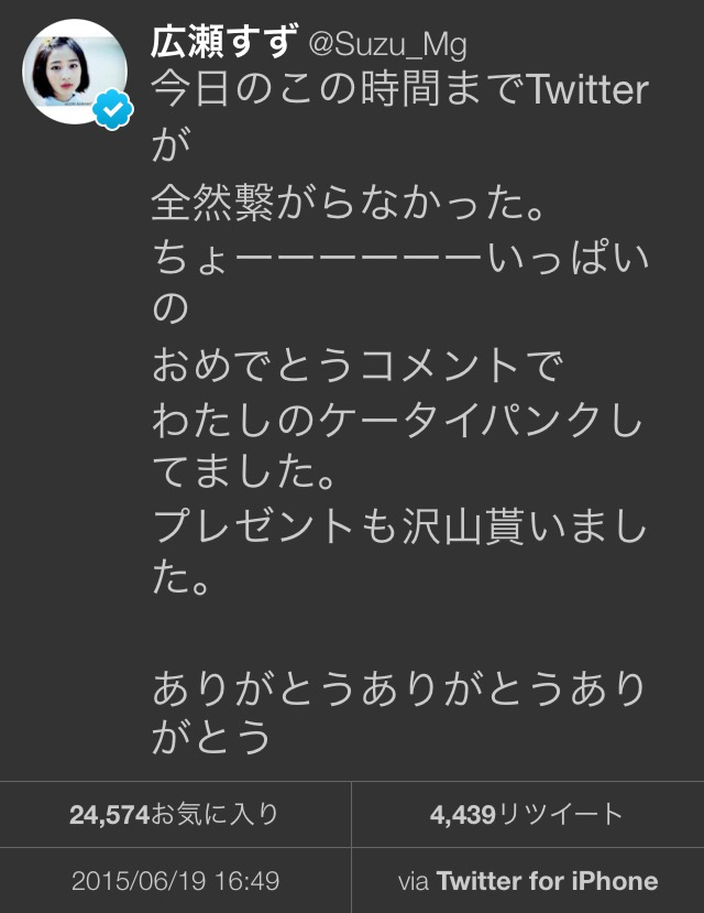 320:風吹けば名無し@\(^o^)/:2015/06/20(土) 16:02:51.20ID:RkQyrX6f0.net誕生日祝ってくれてありがとう