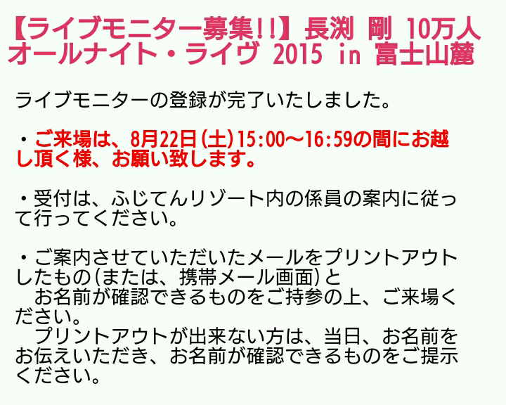 スポンサード リンク【ライブモニター募集!!】長渕 剛 10万人オールナイト・ライヴ 2015 in 富士山麓