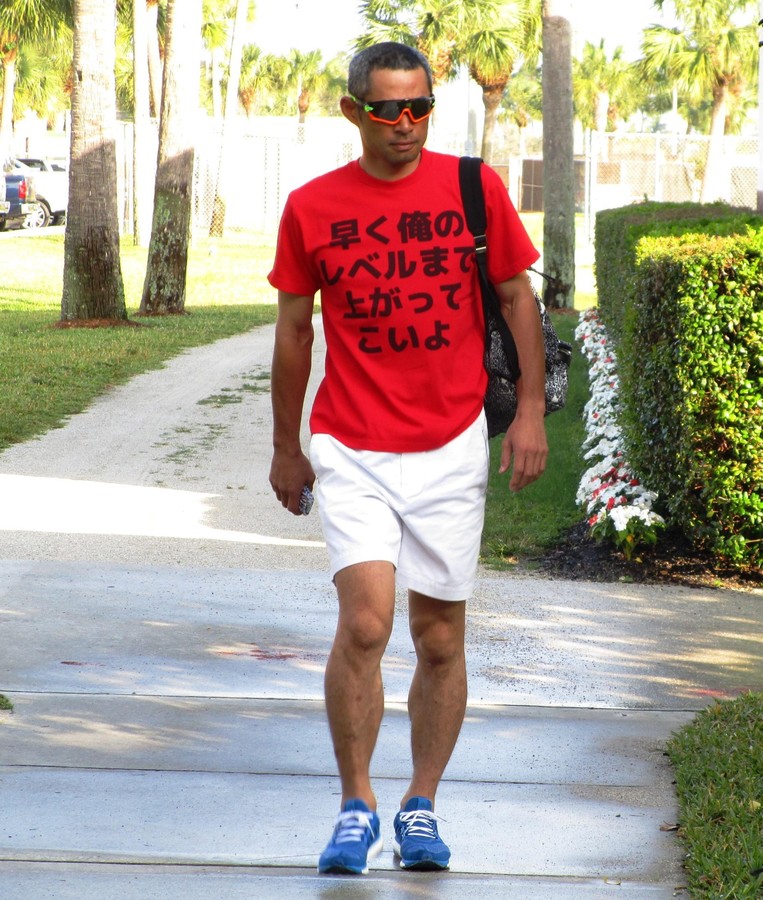 マーリンズのイチロー外野手(42)は、赤地に黒いゴシックの字で「早く俺のレベルまで上がってこいよ」 とメッセージ性の強いTシャツを着て球場入りした。