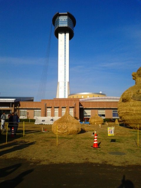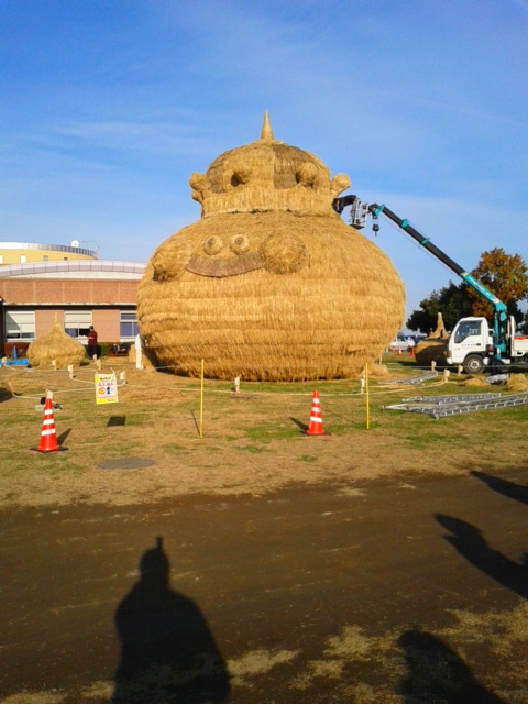 田んぼアートの稲刈り後のわらを使い、武蔵野美術大の学生たちとボランティアの市民、市職員らが作った。