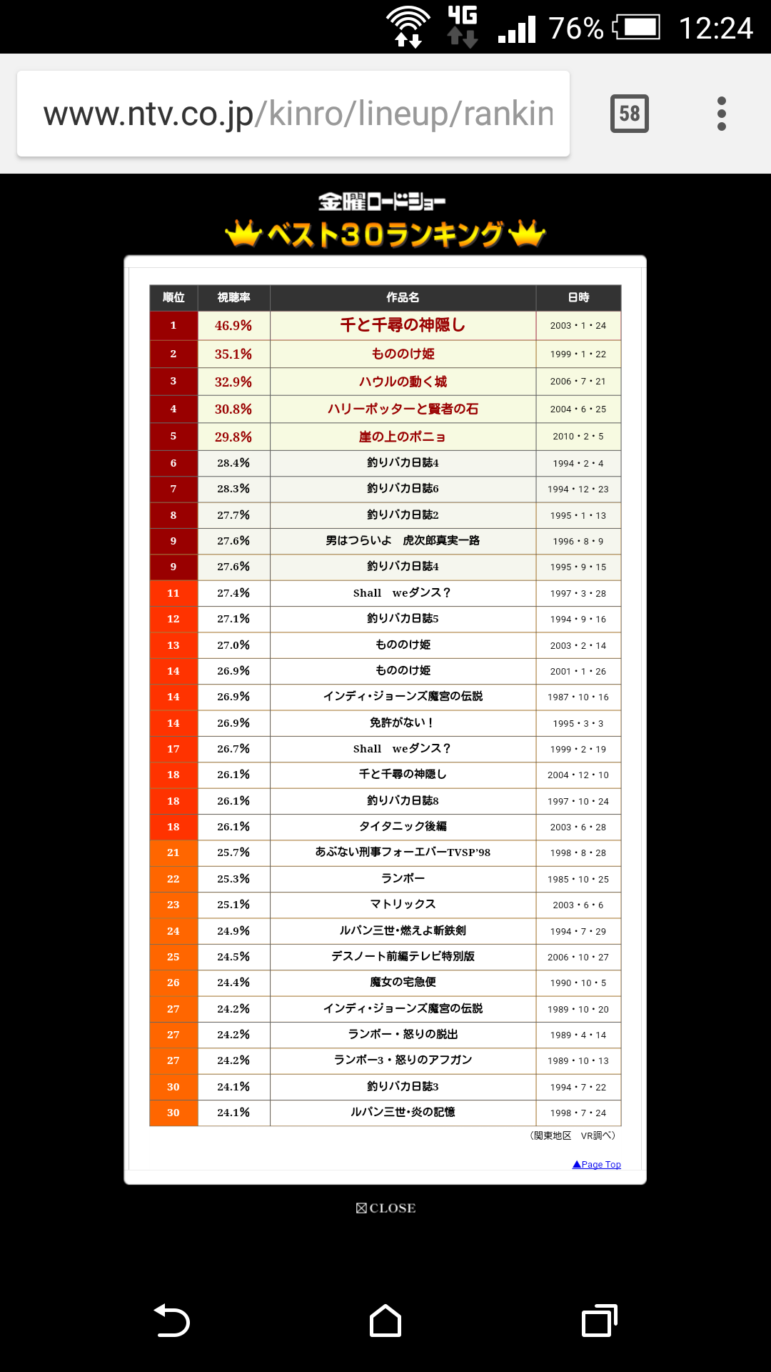 1月13日「風の谷のナウシカ」 関東12.7%