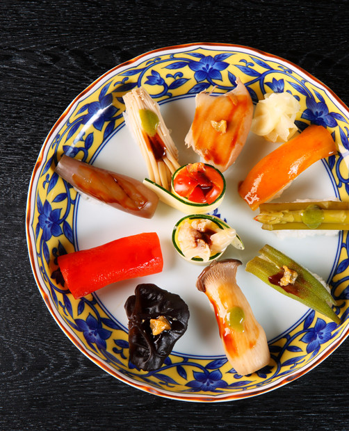 ガリの右隣から時計回りに、パプリカ黄、アスパラガス、オクラ、エリンギ、キクラゲ、パプリカ赤、ナス、エノキ、アワビ茸。中央はミニトマト、ホワイトブロッコリーの軍艦巻き。握りのタネには甘いタレやワサビ味噌、あるいはピューレ状の木の芽を塗り、トマトとブロッコリーにはバルサミコ酢を垂らし、味をつけている。そのため醤油は不要だ。野菜寿司は常時10〜12種用意。1 貫150円(撮影/倉田貴志)