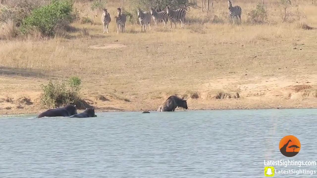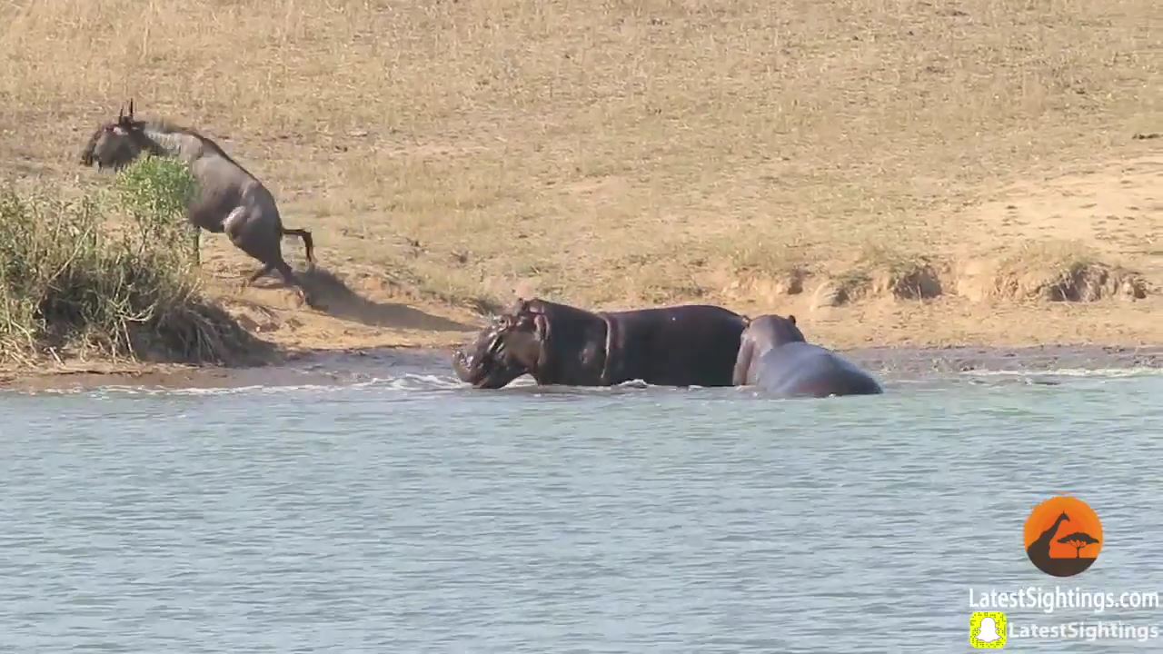 それを見ていた2匹のカバがなんとワニに向かって突進して、ワニを追い払いヌーを助けたのだ。