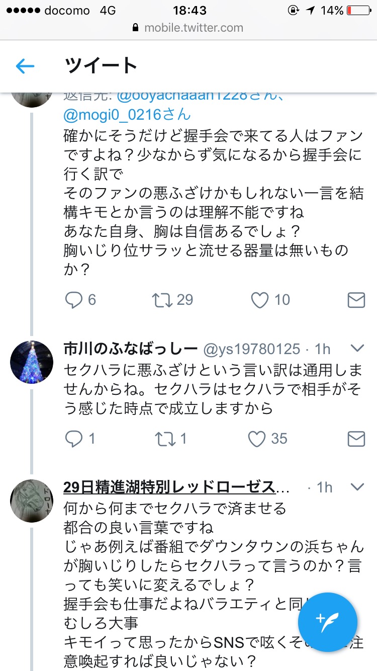 リプで切れてる馬鹿はお前のファンなんだから!金落としてやってんだから!って言えば乳揉ませて当然とか思ってんのかなぁ。