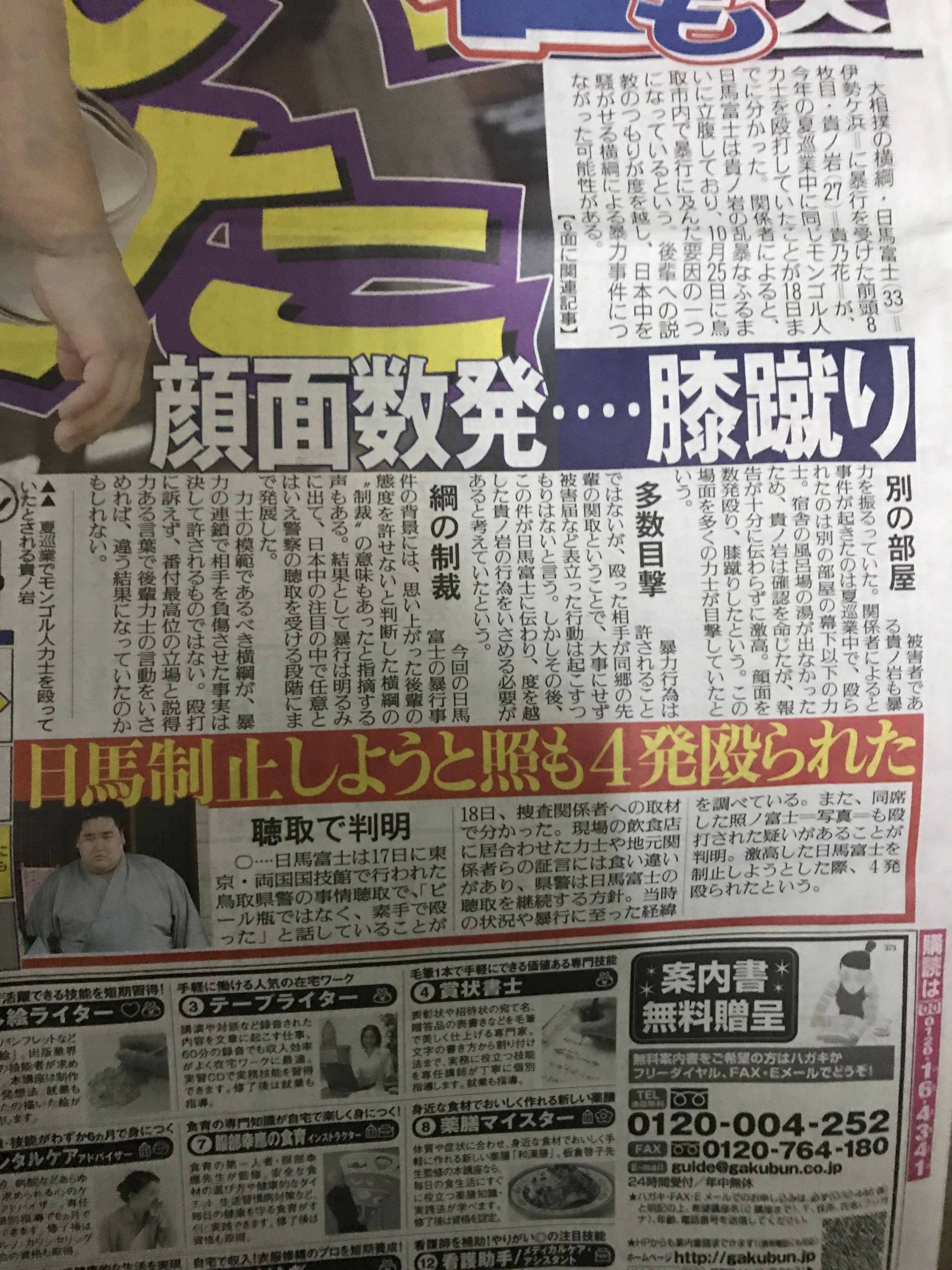 ニッカンだかの日馬富士の記事での実は以前から短気で暴力奮ってただのこの記事の貴ノ岩の暴行疑惑とかそんとき表沙汰にせんと意味ないやろ