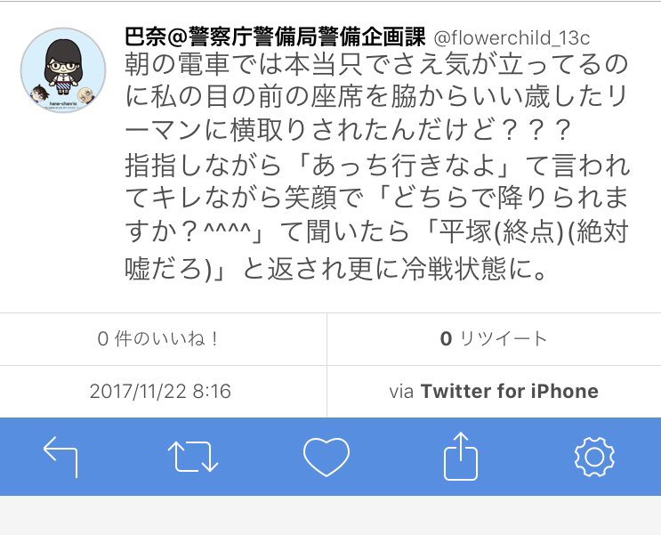 指指しながら「あっち行きなよ」て言われてキレながら笑顔で「どちらで降りられますか?^^^^」て聞いたら「平塚(終点)(絶対嘘だろ)」と返され更に冷戦状態に。