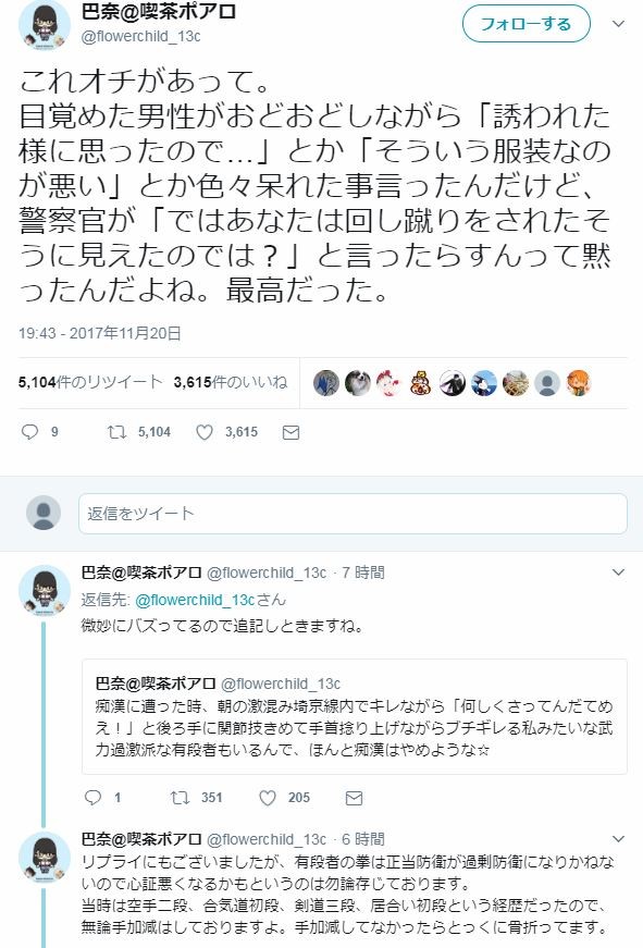 そんなんで色々言われてるのなら、痴漢されて駅で逃げられそうになった時的確に脇の下への上段回し蹴りで男性2時間気絶させて鉄道警察隊に「気持ちは分かるがやり過ぎです」と言われた私(有段者)はどうなるんだよ…逮捕か?おい…