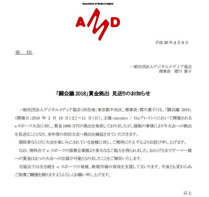 「闘会議 2018」賞金拠出 見送りのお知らせ