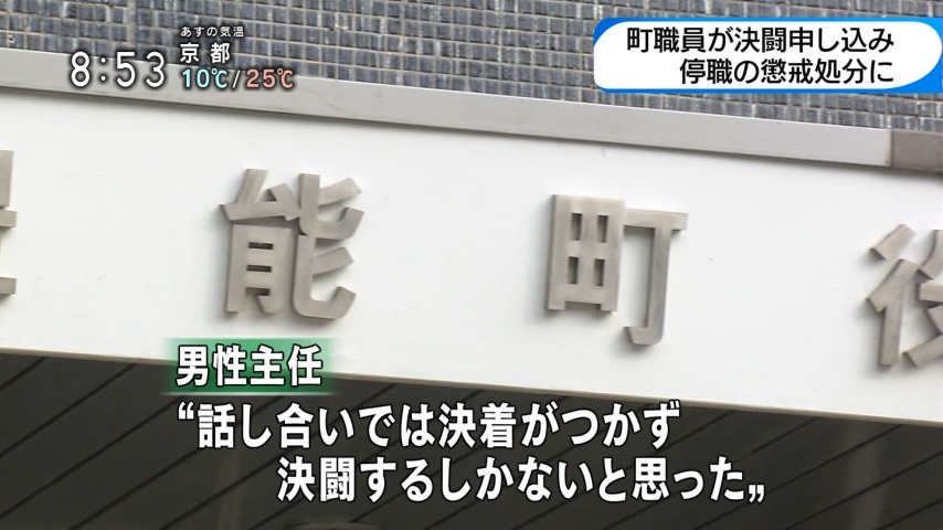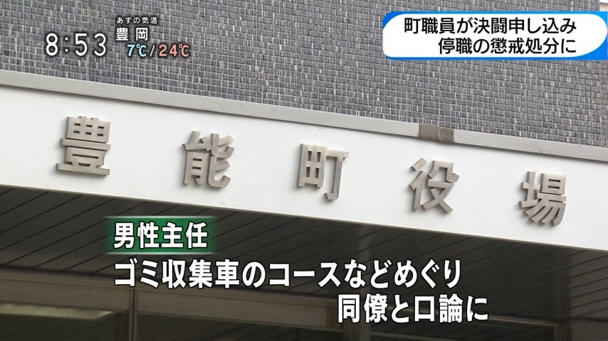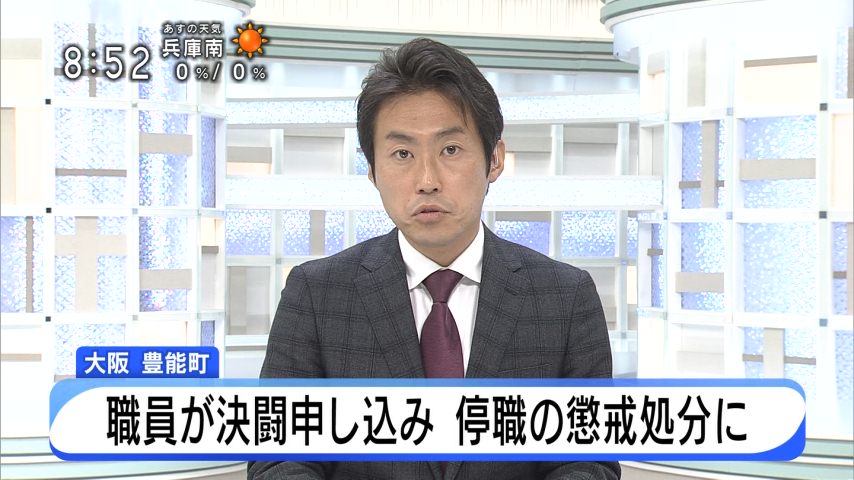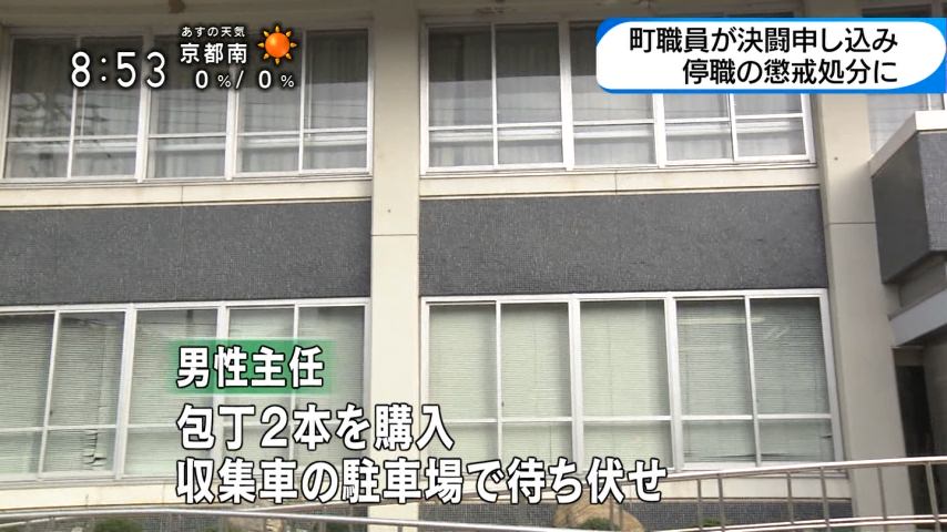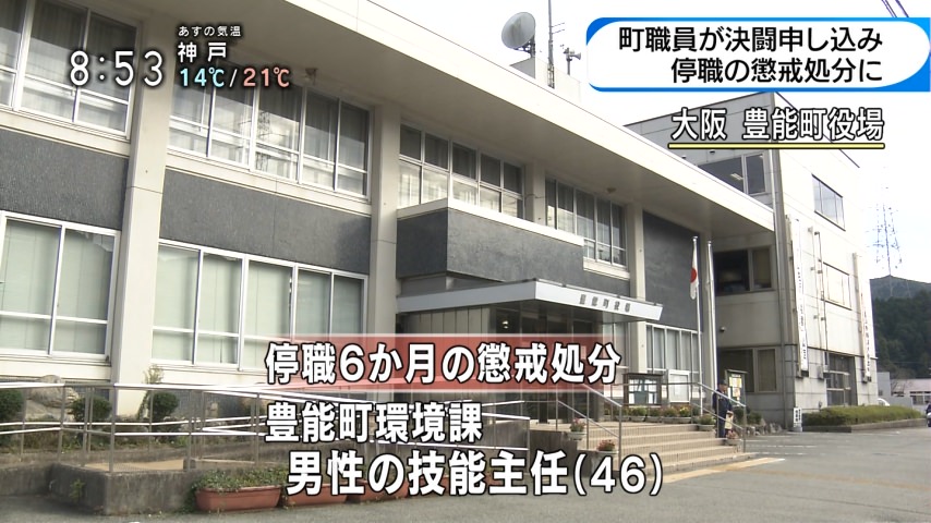 大阪府豊能町は、同僚に包丁を見せて決闘を申し入れるなどしたとして、環境課の男性職員(46)を停職6カ月の懲戒処分にした。