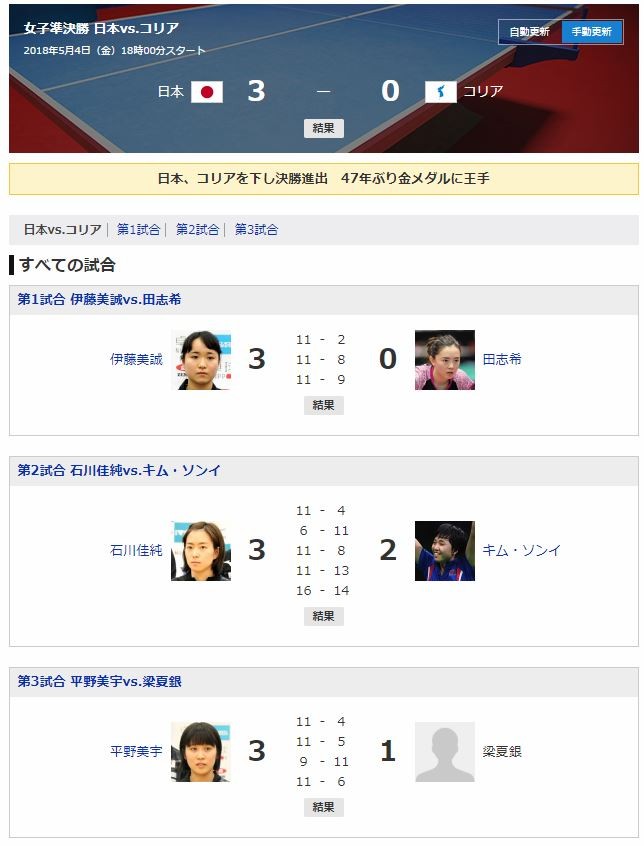 伊藤美誠(スターツ)が田志希(韓)に3―0、石川佳純(全農)がキム・ソンイ(北朝鮮)に3―2、平野美宇(日本生命)が梁夏銀(韓)に3―1で勝った。「コリア」は、準々決勝で対戦予定だった韓国と北朝鮮の両協会と、国際卓球連盟の3者が協議し、急きょ結成された。