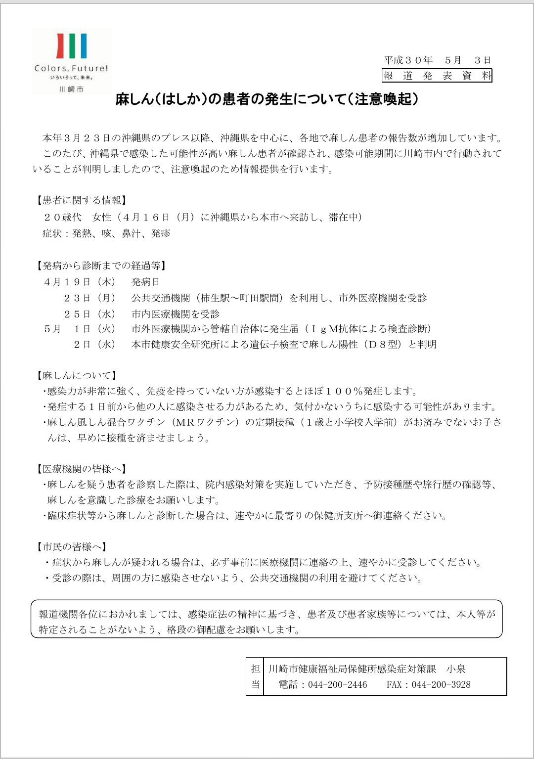 38度以上の高熱に発疹。1000人に1人が死亡するというはしかの感染が急激に拡大している。川崎市は3日、市内に滞在していた沖縄県の20代の女性がはしかに感染していたことを発表した。