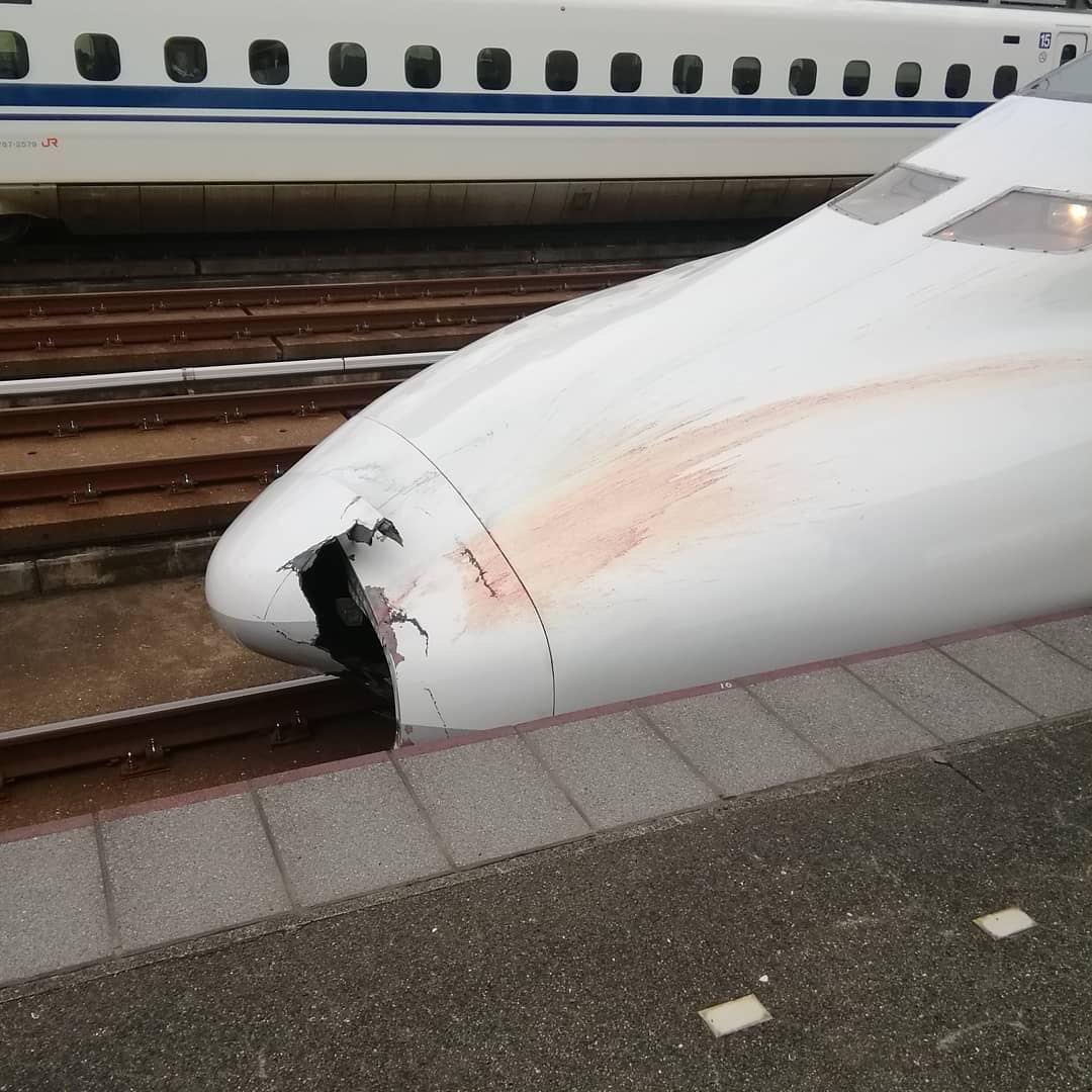 14日午後2時10分頃、JR小倉駅(北九州市)を発車した博多発東京行きの山陽新幹線「のぞみ176号」(16両編成)の先頭車両のボンネットが破損しているのを、すれ違った新幹線の運転士が発見。