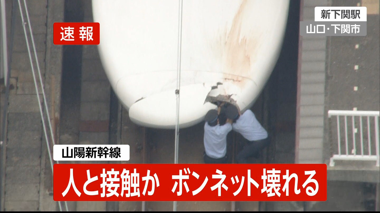 新下関駅(山口県下関市)で緊急停車させて車両を点検したところ、破損したボンネットの内部から人体の一部が見つかった。福岡、山口両県警やJR西日本は、走行中に人をはねたとみて調べている。