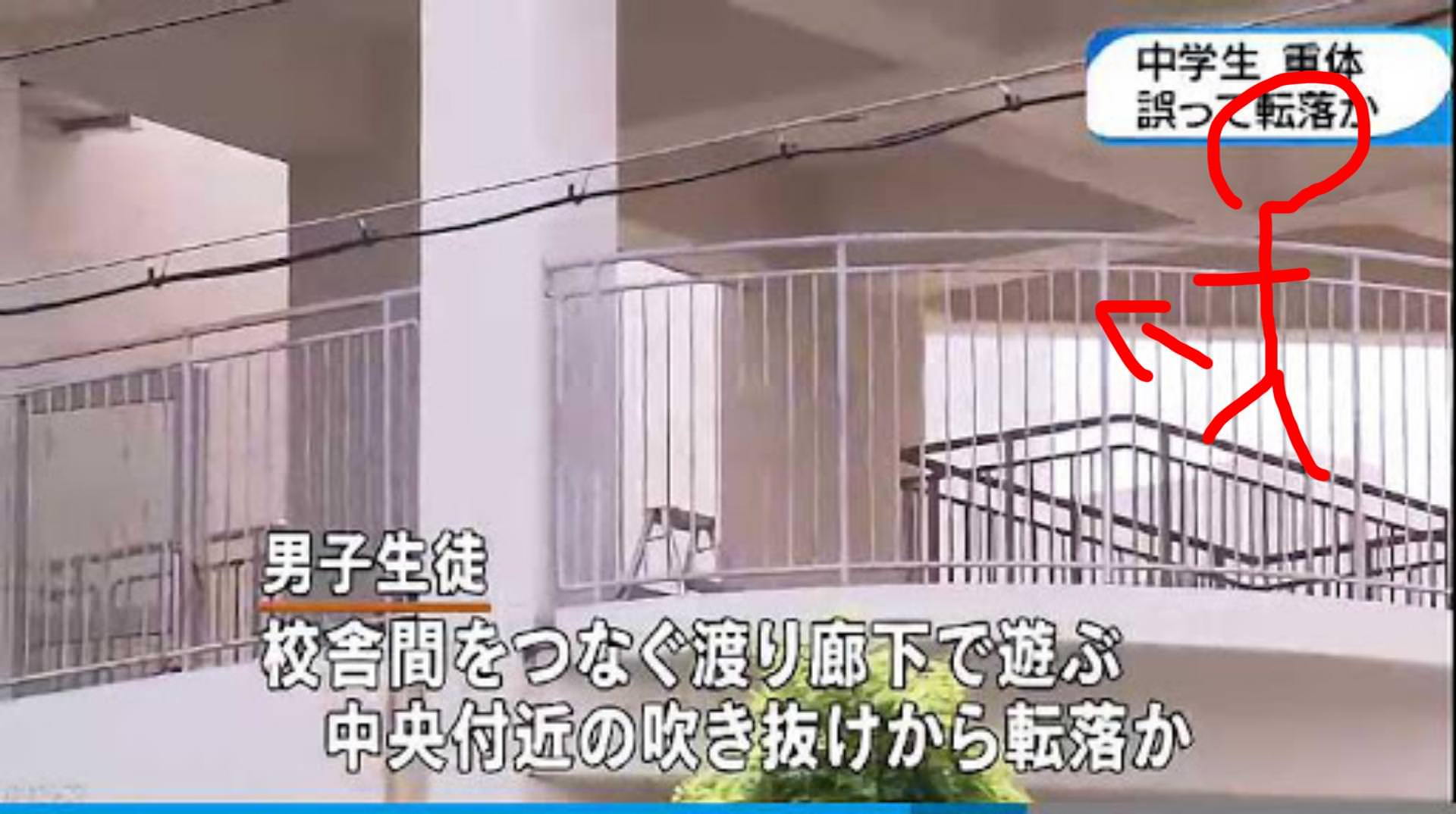 ニュースだと休み時間に遊んでて吹き抜け部分を飛び越えようとジャンプしたときに、天井に頭ぶつけてそのまま落下したと言ってたな