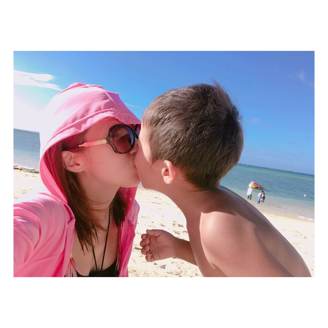 息子と熱いキスを交わしているかのような写真も。沖縄の美しい海と空をバックにキス…最高のロケーションとも相まって、家族にとっては特別な1枚となりそうだ。