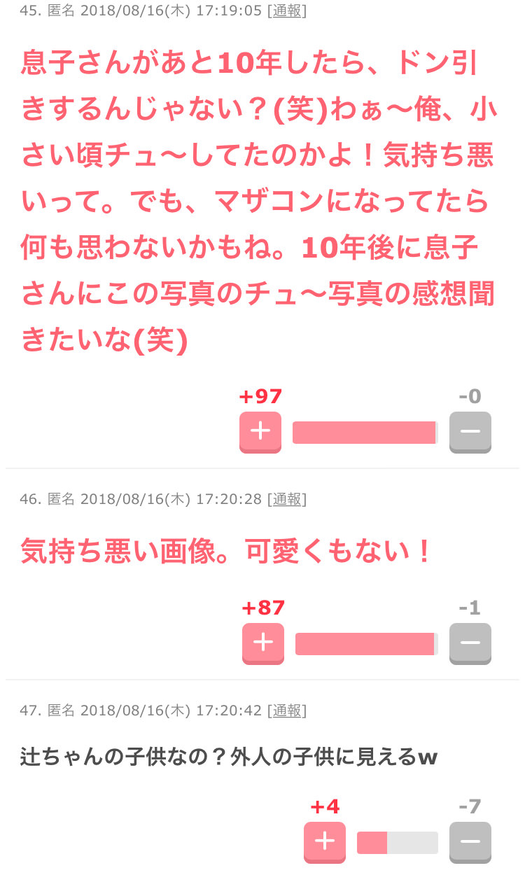 ・(辻を)擁護してる人はもし、自分の彼氏や旦那の写真見てたらお母さんとポッキーちゅうしてる写真発見しても引かないで微笑ましく思えるのかね。 私は無理だわ。見方変わるか、しばらくモヤモヤする自信あるわ
