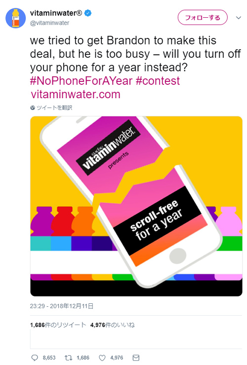 ビタミンウォーター公式Twitterアカウントに「1年間スマートフォンのない生活に10万ドルを支給」と投稿。