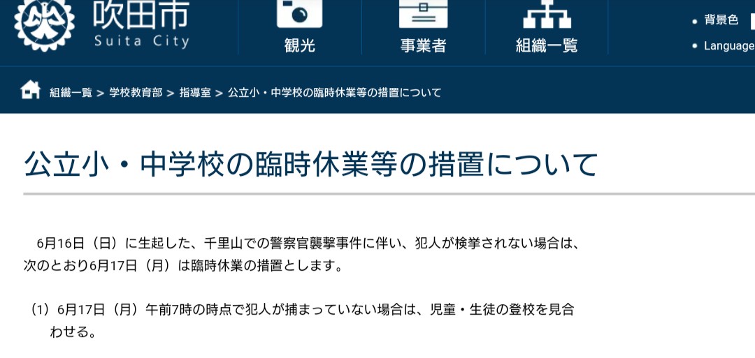 吹田市で発生した事案に伴う学校園の臨時休業措置等について