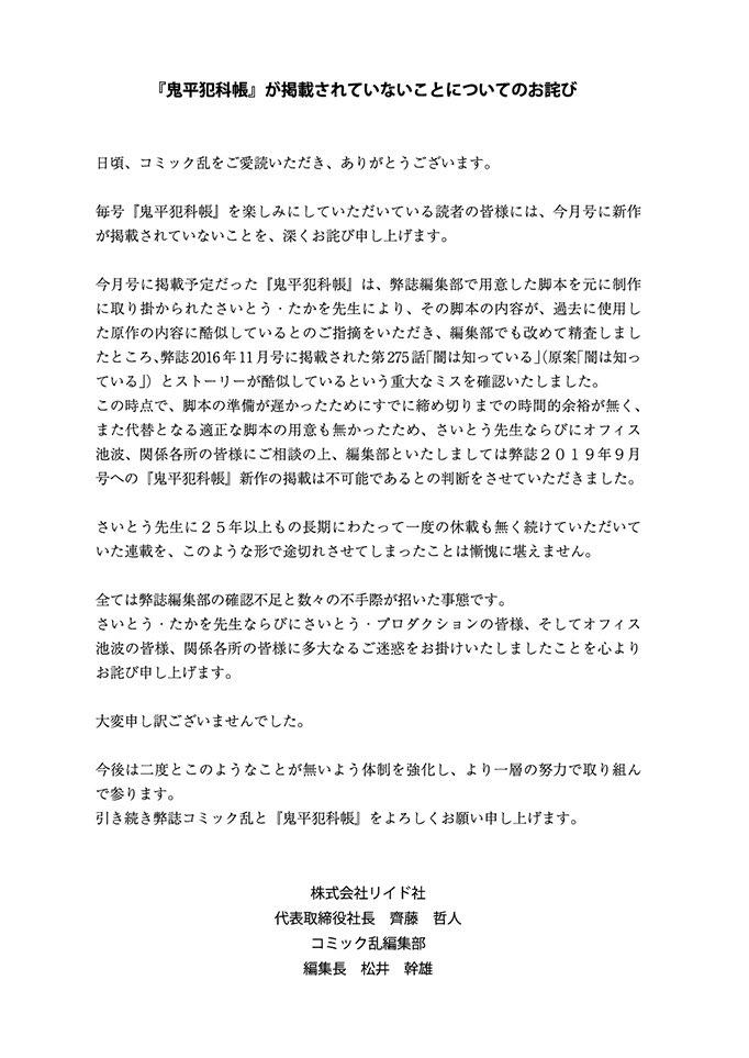 26日発売の時代劇漫画誌「コミック乱」の9月号で、さいとう・たかをさんの人気連載「鬼平犯科帳」が不掲載となった。「鬼平犯科帳」は「ゴルゴ13」と並ぶさいとうさんの代表作の一つ。池波正太郎さんの小説が原作で、1993年の連載開始からこれまでは休載することなく続いていた。編集部の脚本ミスが理由という。