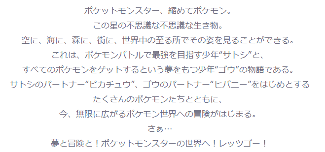 これは、ポケモンバトルで最強を目指す少年 “サトシ” と、すべてのポケモンをゲットするという夢をもつ少年 “ゴウ” の物語。