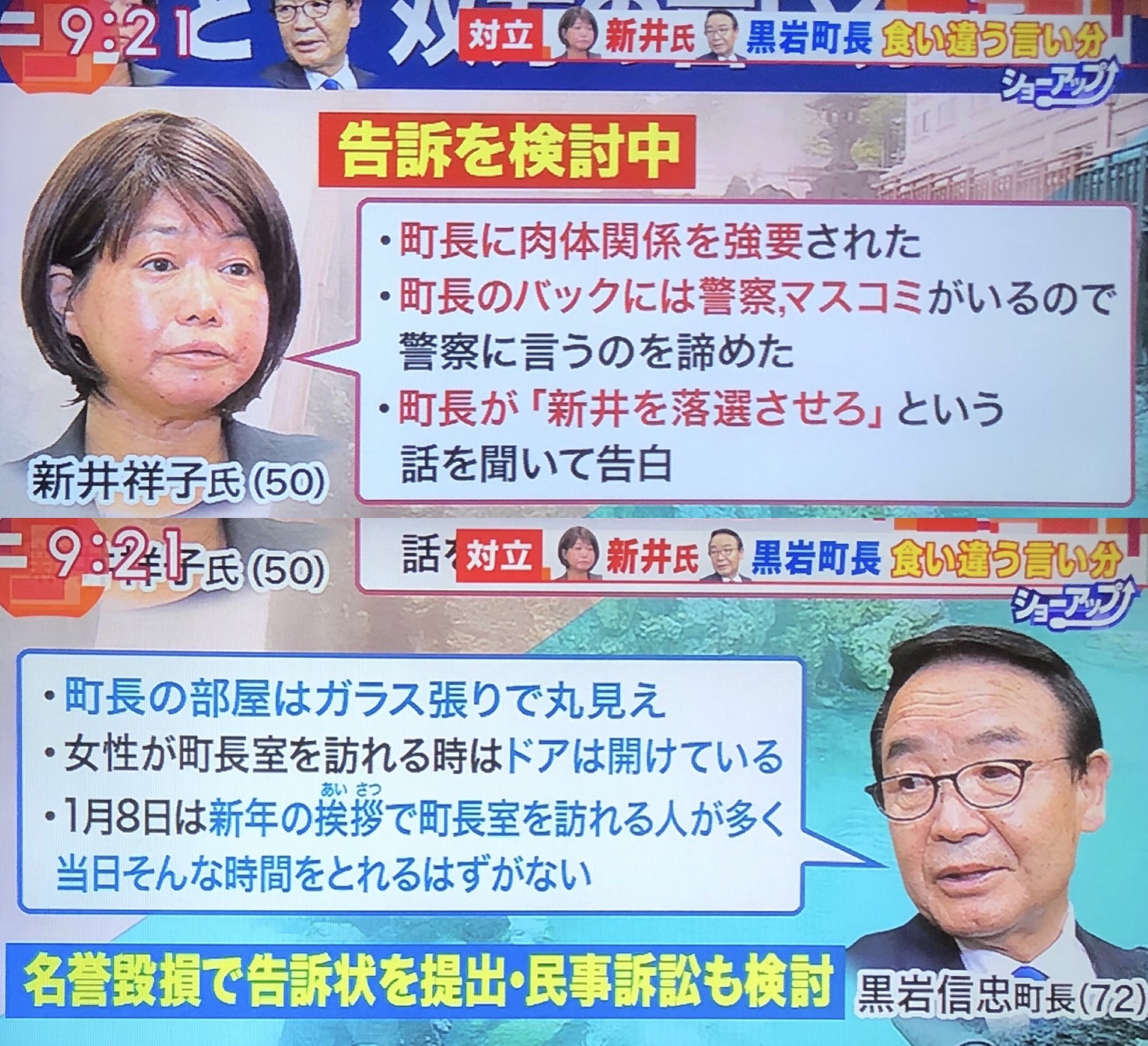 15年1月8日午前10〜11時に町長室で2人きりで面会した際、性的な行為をされたと実名で告発していた。