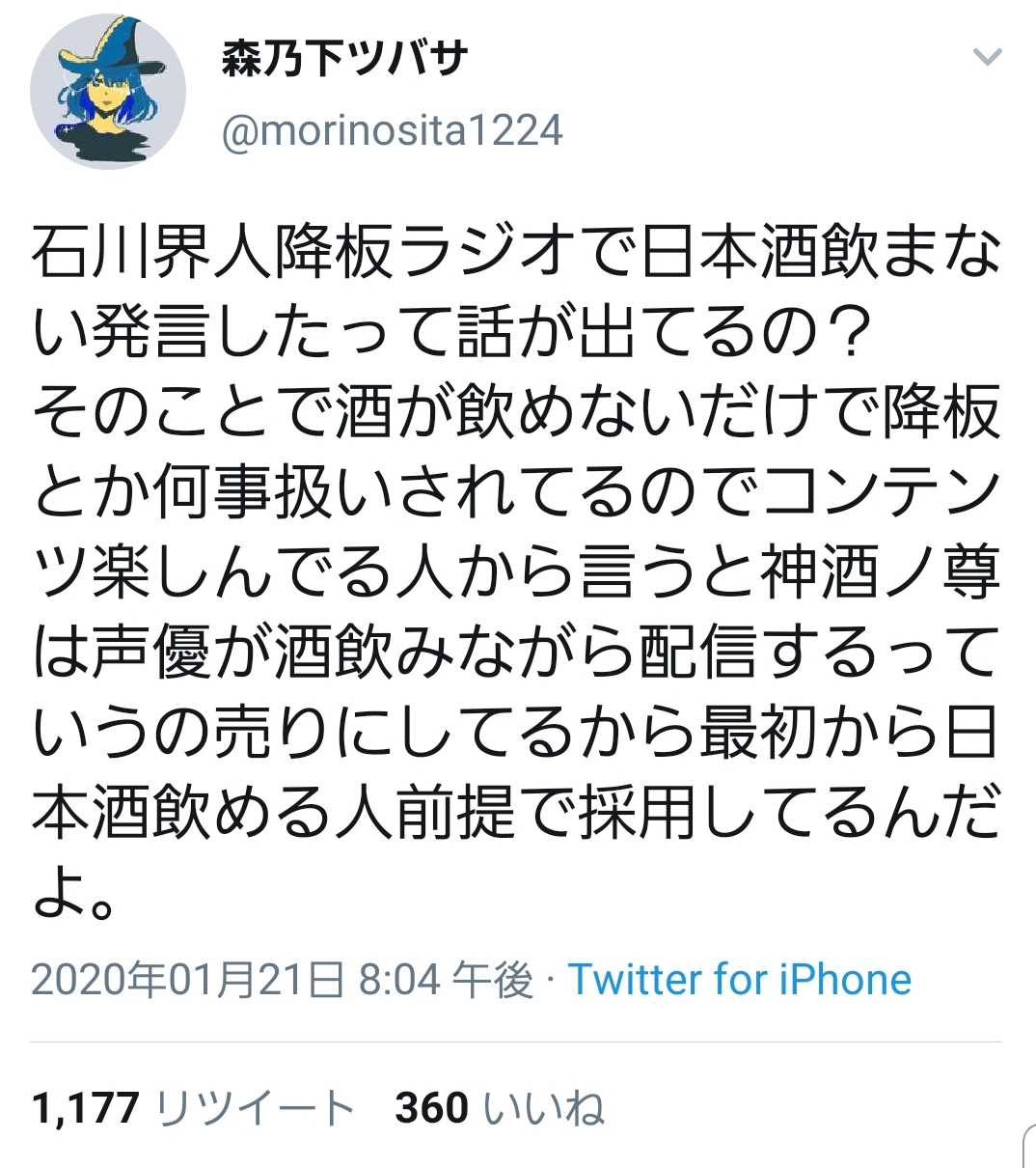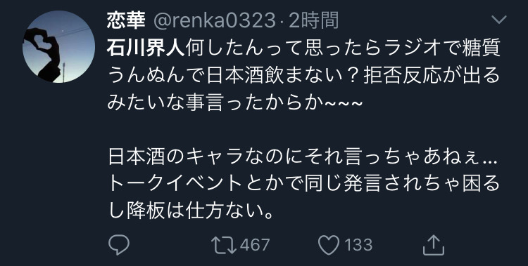 友達と前に石川界人さんのラジオを聴いていた時に 日本酒をみると吐き気がする とか女性は日本酒飲むと太るから飲まないほうがいいとか言ってて日本酒好きの友達めっちゃキレててめっちゃ笑ったけどこれのことかな?