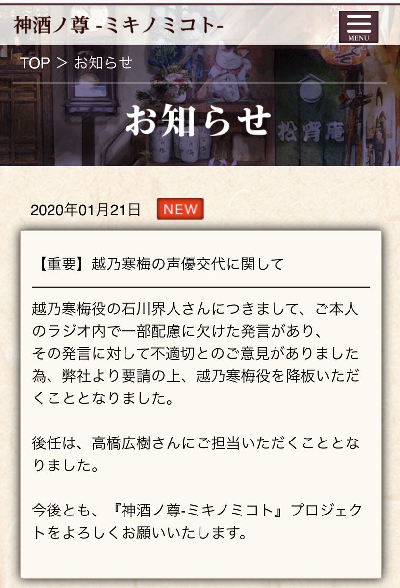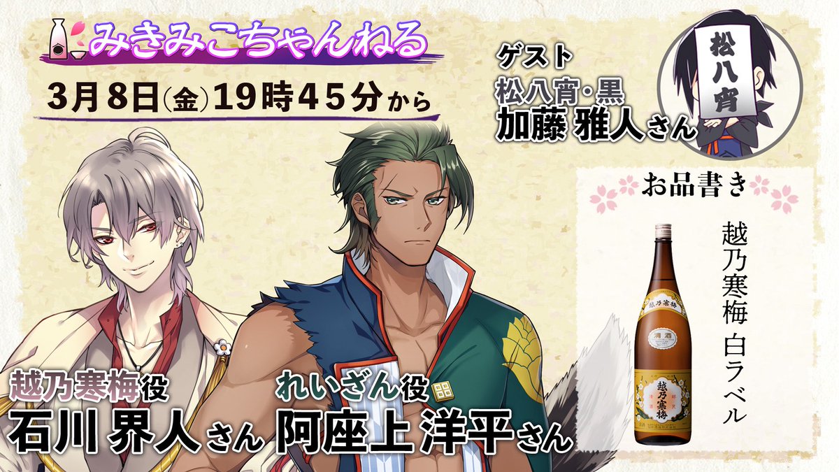 石川界人『神酒ノ尊-ミキノミコト-』越乃寒梅役、降板につきまして