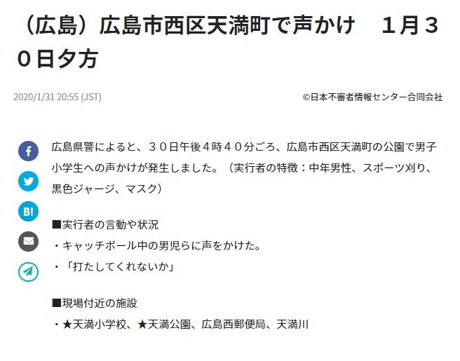 広島県警によると、30日午後4時40分ごろ、広島市西区天満町の公園で男子小学生への声かけが発生しました。(実行者の特徴:中年男性、スポーツ刈り、黒色ジャージ、マスク)