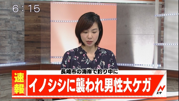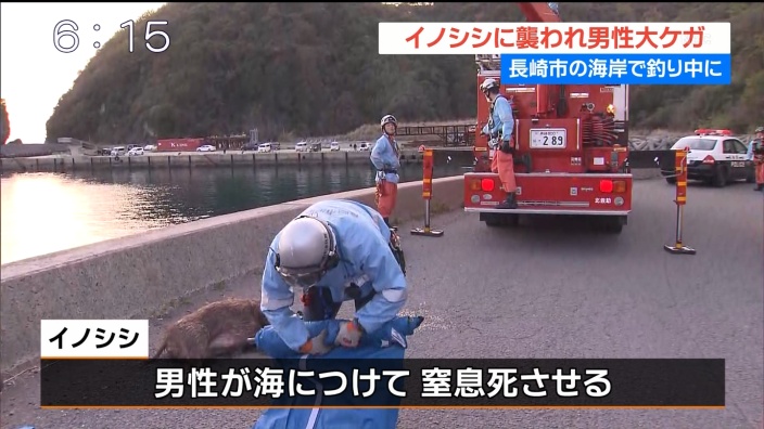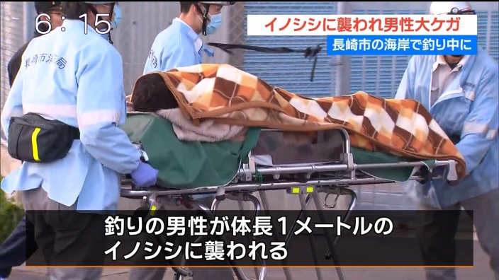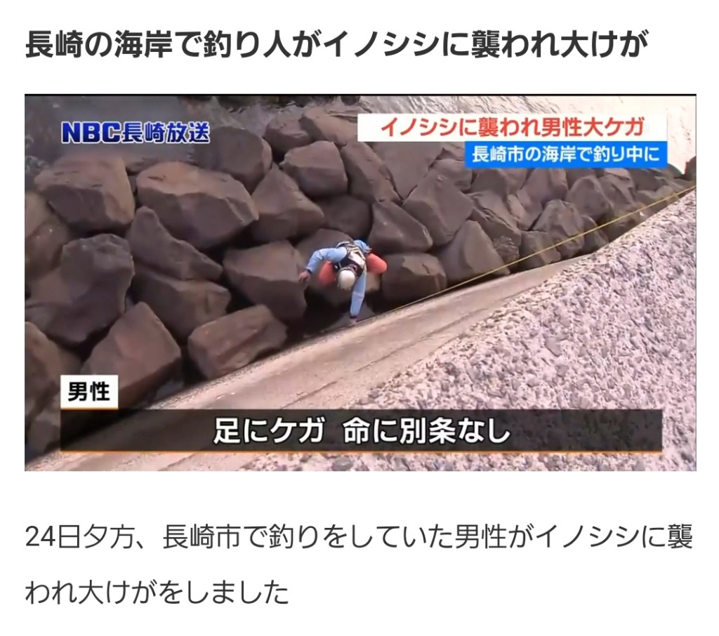 24日午後、長崎市小江町の岩場で釣りをしていた50代男性が、海から上がってきたイノシシに襲われた。