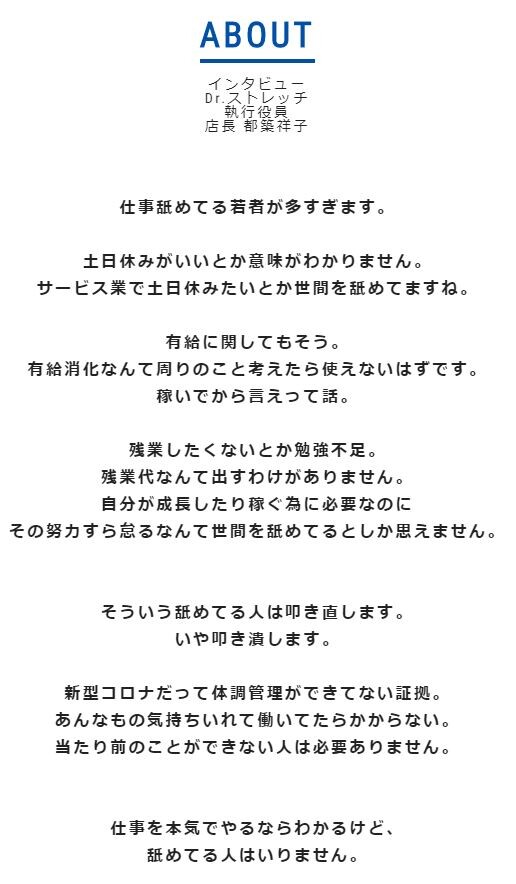 求人サイト上のつながり社のページには、「仕事舐めてる若者が多すぎます」から始まる執行役員のインタビューが掲載されていた。有給休暇を望む若者へは、「有給消化なんて周りのこと考えたら使えないはずです。稼いでから言えって話」とコメント。残業については、「残業したくないとか勉強不足。残業代なんて出すわけがありません」とした。さらに、「新型コロナだって体調管理ができてない証拠。あんなもの気持ちいれて働いてたらかからない。当たり前のことができない人は必要ありません」と断じている。