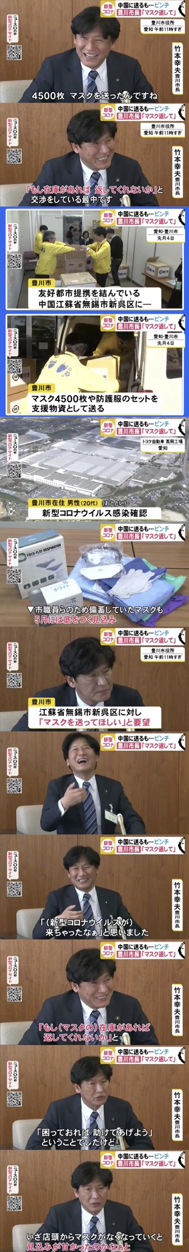 愛知・豊川市は、友好都市提携を結ぶ中国・江蘇省の街に4500枚のマスクを支援物資として送った。しかし、マスク不足に陥ったことから、もし在庫があれば返してくれないかという交渉をしているという。