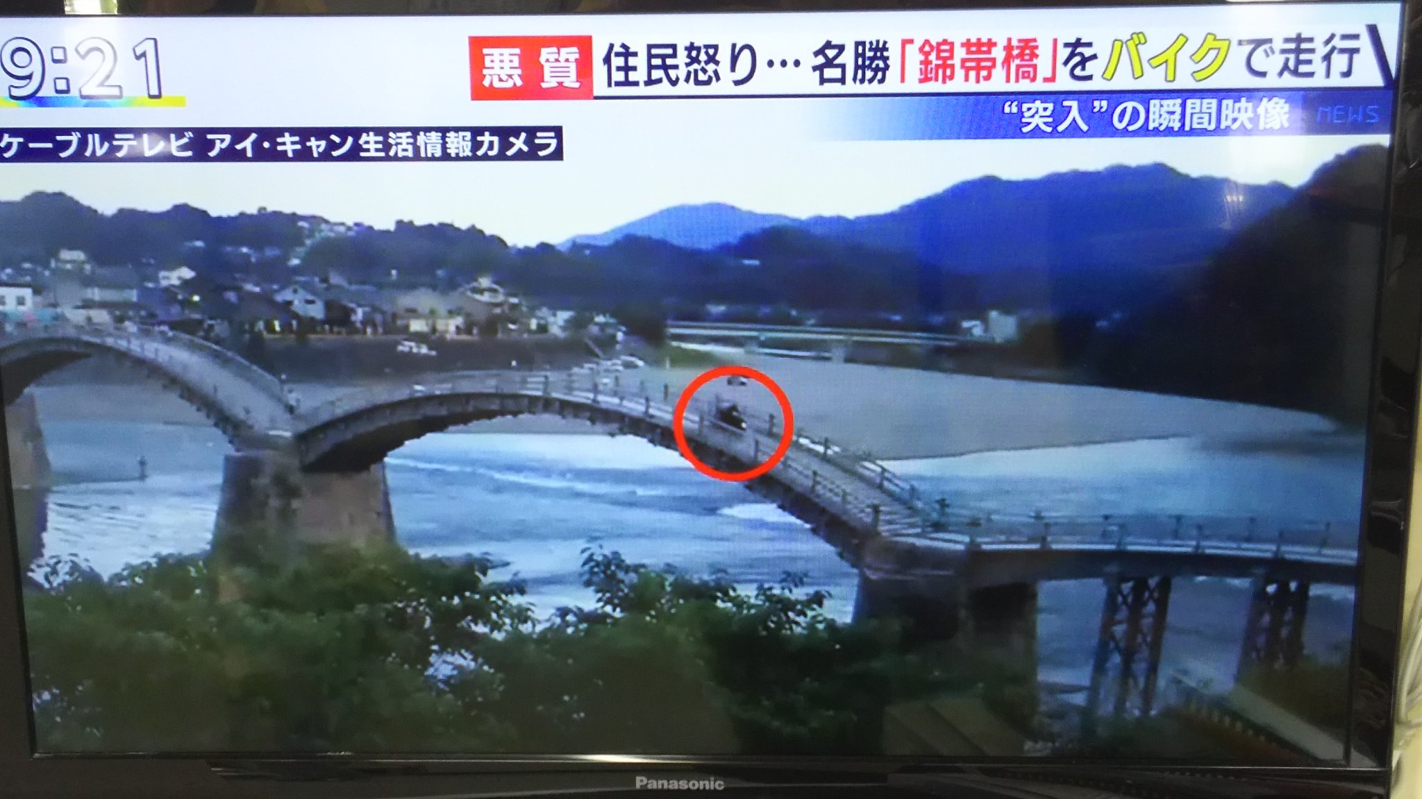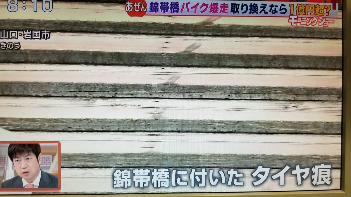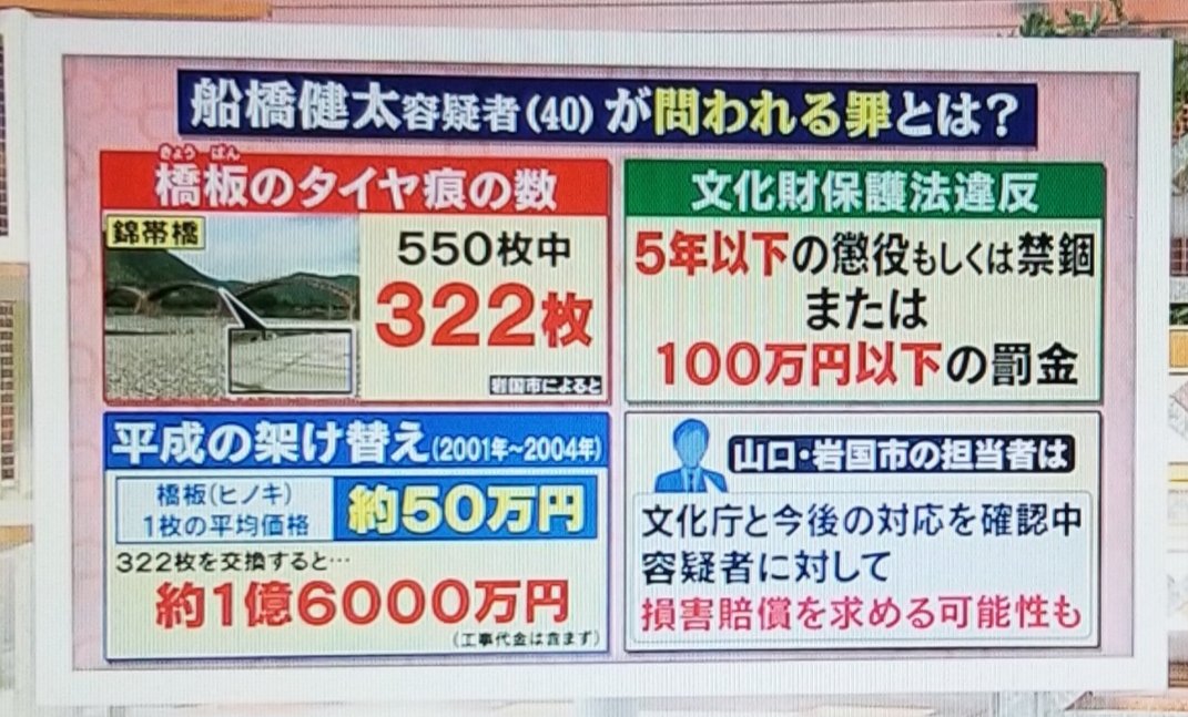 逮捕されたのは、岩国市南岩国町の建設作業員・船橋健太容疑者(40)です。警察によりますと、船橋容疑者は今月17日の夕方文化財保護法で国の名勝に指定されている岩国市の錦帯橋にオートバイで侵入して走行し、橋にタイヤの跡などをつけ名勝を毀損させた疑いが持たれています。