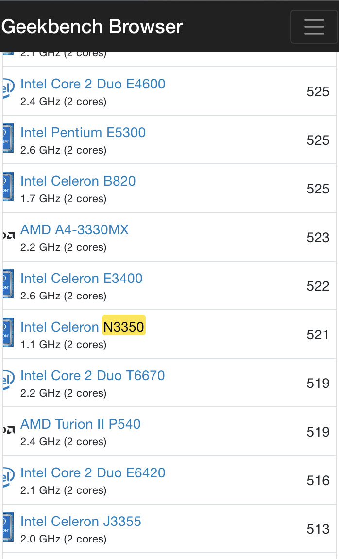 https://www.cpubenchmark.net/cpu.php?cpu=Intel+Celeron+N3350+%40+1.10GHz&id=2895