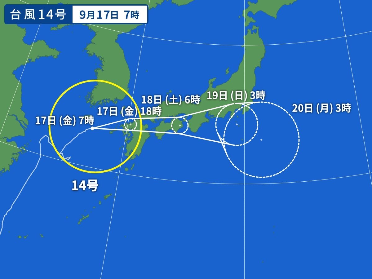 台風14号は午後以降に上陸の見込みです。その後は四国や近畿を横断しながら東へ進むとみられています。