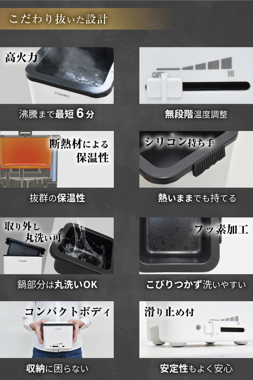 場所を取らないコンパクトサイズながら、インスタント袋麺がぴったり収まるサイズに設計。麺にスープが浸かるので、麺の茹でムラなく調理が可能。高火力のヒーターを底面全面に搭載し、美味しく調理が可能。約6分で500mlの水を沸騰できます。側面4か所の断熱材により熱が冷めにくい構造を実現しました。全面のスライドスイッチで無段階の火力調整が可能。約40度〜100度の温度目安でお使いいただけます。麺が食べ終わった後にはそのままお米を投入しシメまで美味しく味わうことが可能。お茶碗1杯分のお米が入ります。鍋部分はこびりつきを防止するフッ素加工。鍋は取り外し可能で丸洗いができます。
