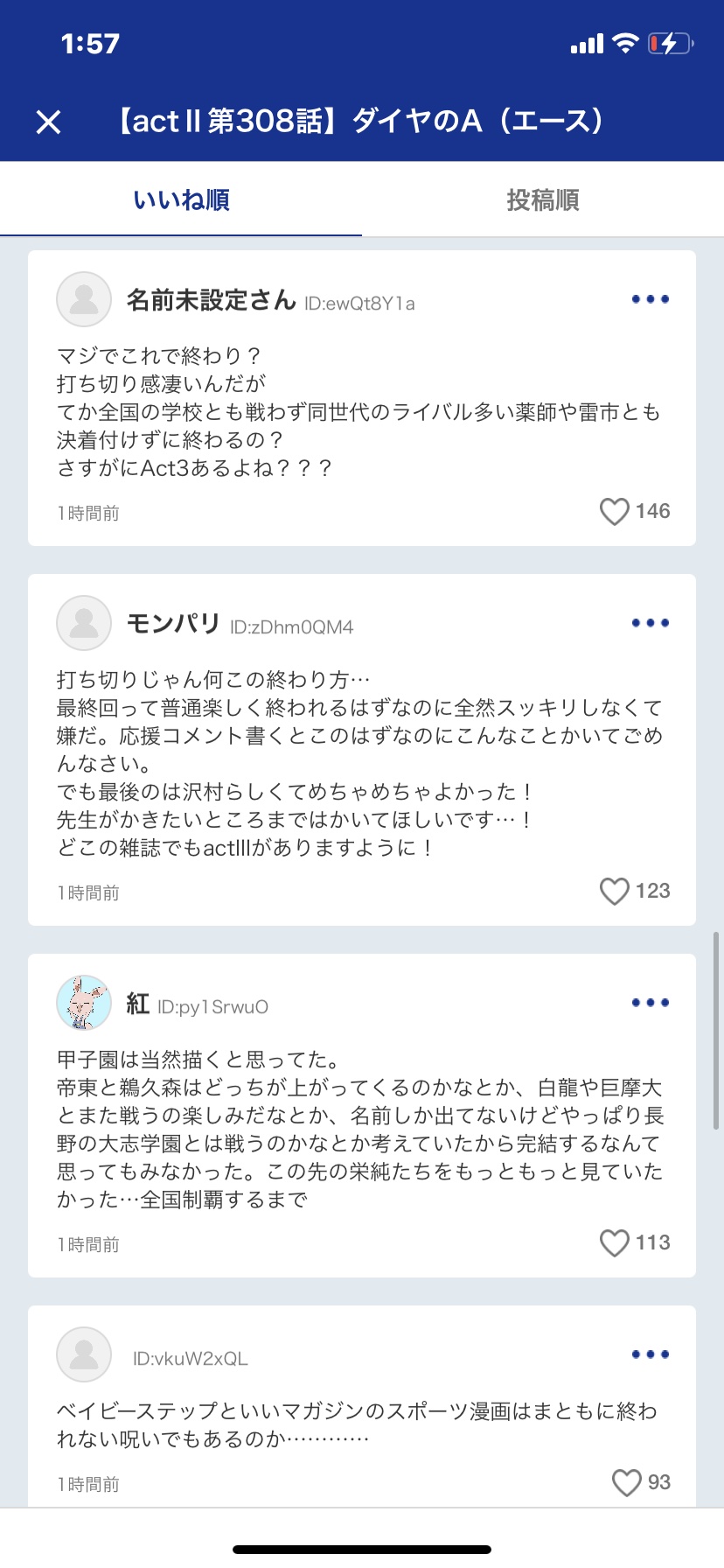 NARUTO、BLEACHでも70巻で完結したと考えるとそこまで人気落ちてないとはいえダイヤのAで100巻越え、200巻越えはどうなのかと思うし編集か作者の判断か分らんが終わらせるのはしゃーないと思う