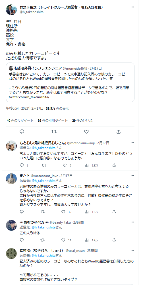 — 竹之下裕之(トライトグループ創業者・現TSACE社長) (@h_takenoshita) February 16, 2023