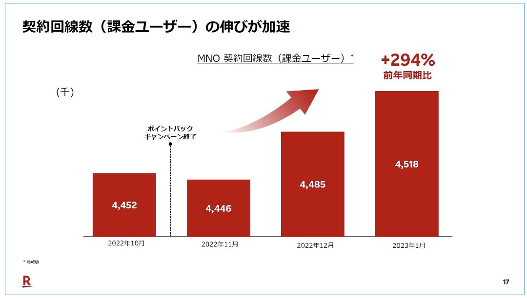 ARPUについては2022年9月時の2,408円から2022年12月時は2,510円まで上昇。三木谷氏は「第1目標である3000円に向かって順調に成長している」と評価。また、0円プラン廃止により1GB以上を利用するユーザーが純増したことについて「血の入れ替えが進んでいる」と表現しました。