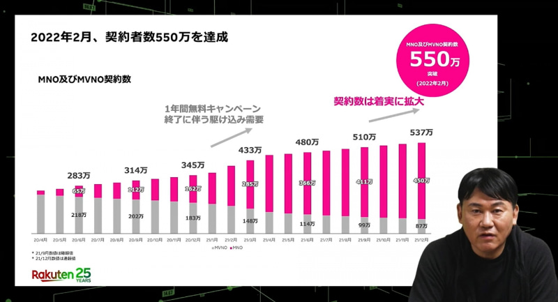 楽天が14日に実施した2022年度通期および第4四半期の決算説明会にて、楽天モバイルの契約回線数が2023年1月時点で451万8000件を突破したことが明らかになりました。
